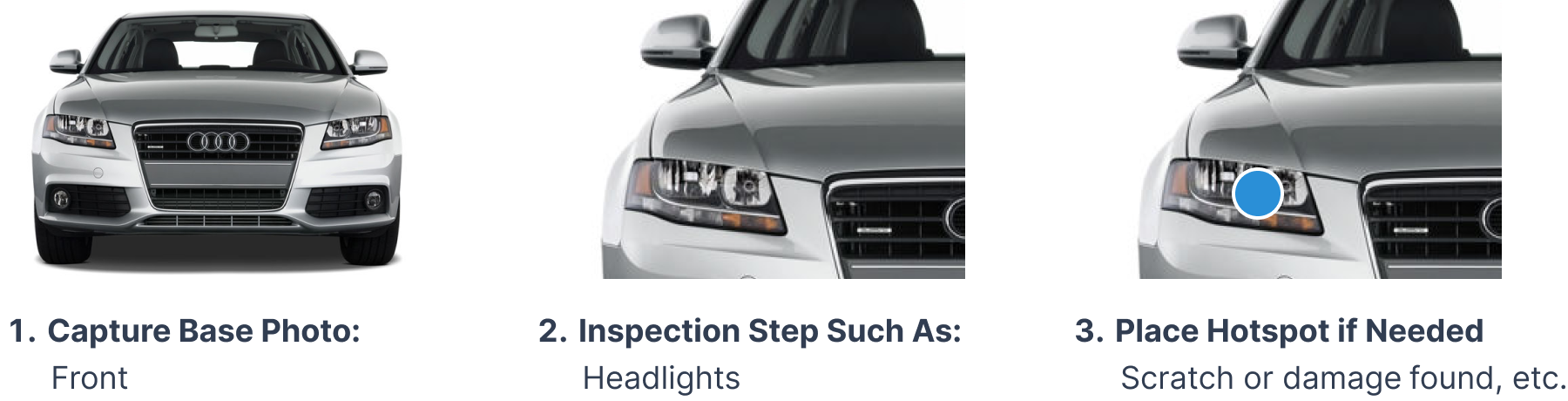 This feature of the C.A.R.Score app allows users to inspect a vehicle by capturing a base photo, for example the “Front” of the vehicle, and then following inspection steps for such base photo. In this case, an inspection point could be the headlights, hood, or grill among others. A user can then place a hotspot if there is visible damage to be reported such as a dent or scratch. This process repeats itself throughout the entire exterior and interior of the vehicle.