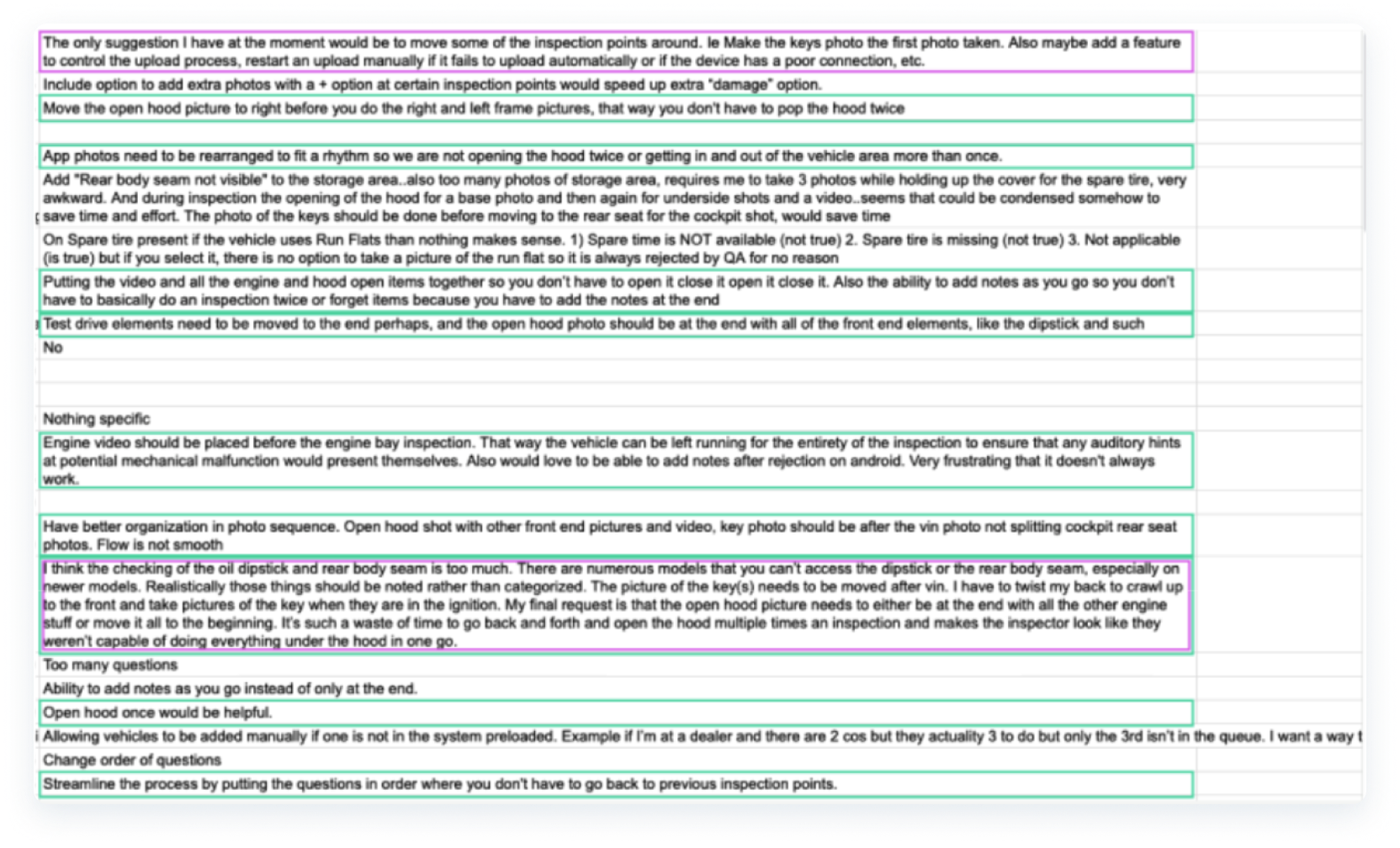 - It was frustrating to have to open the vehicles’ hood multiple times to complete an inspection. One to capture a base photo of the engine, and later again to perform engine-related inspection steps. This pain point repeated itself throughout other steps.