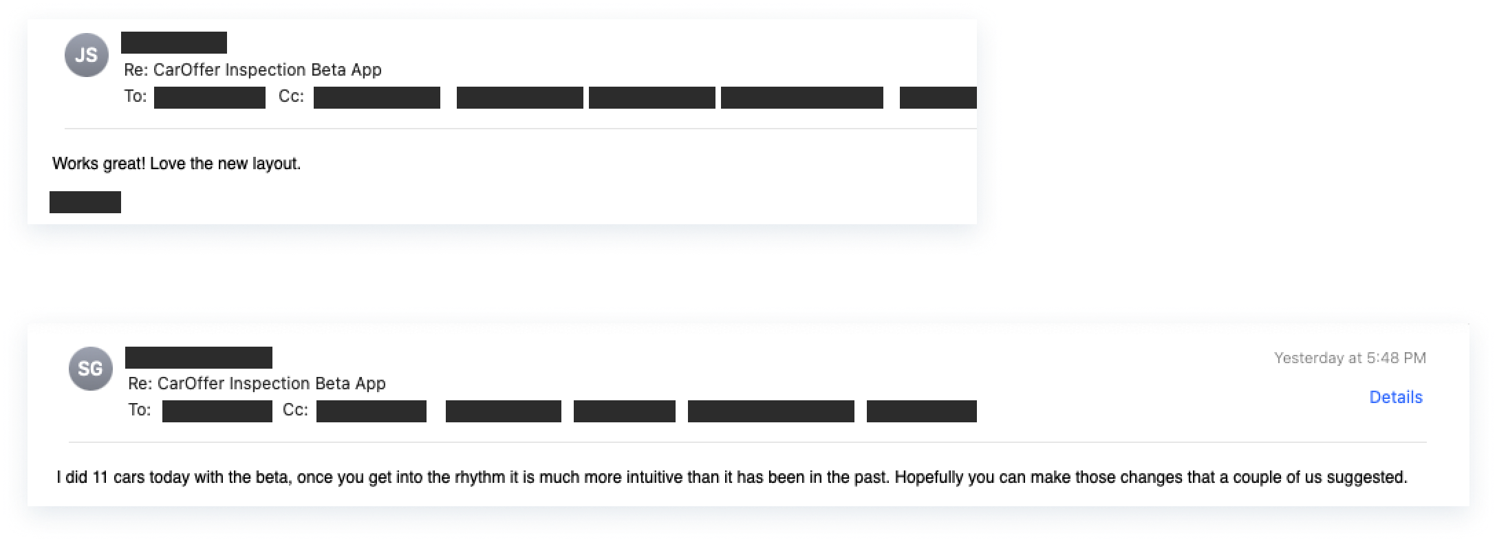 We interviewed our users to uncover and address their pain points. Starting with a survey that was shared with 50+ representatives/photographers, and later with in-person interviews with a group who generally had a high volume of inspections within the past 3 months, we were able to get qualitative and quantitative data about certain steps that weren’t optimal, the time it took them to complete a vehicle, and more.