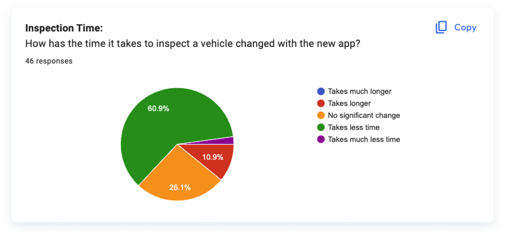 - Average time it took to inspect a vehicle depended on multiple factors (type of vehicle, dealership parking lot accessibility, weather conditions, time of day, and more) but generally speaking, 30 minutes seemed average and users wanted this reduced.