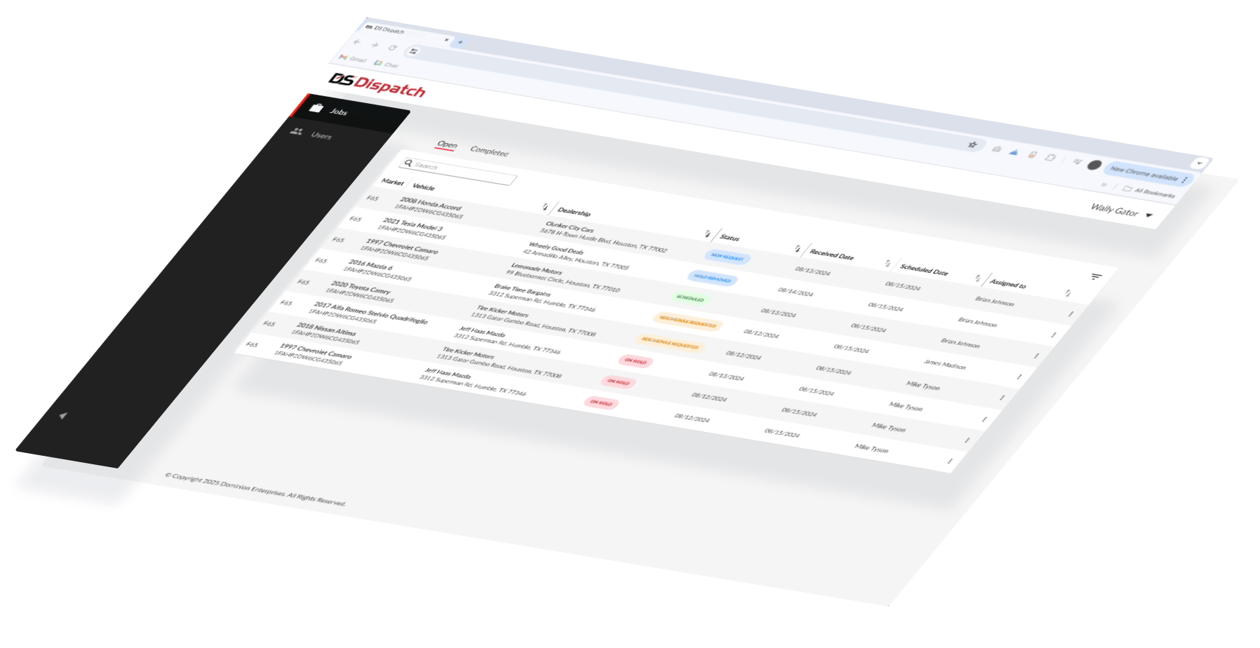 After the final testing sessions, I delivered high-fidelity designs for DS Dispatch, including a "Jobs" page for job scheduling/assignment, and a "Users" page for market and role management. These experiences integrate with the mobile app that lot techs use to view real-time job updates and statuses.