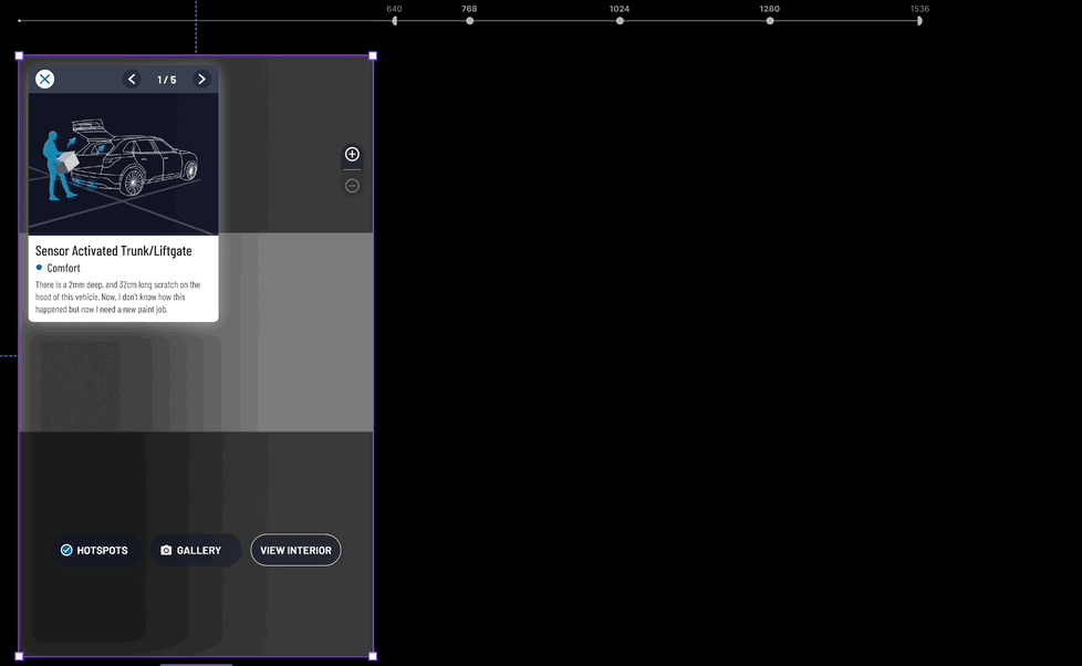 - “Walkaround Mode” Figma prototype featuring footage I captured in a parking lot with my vehicle, immersing myself in the perspective of our end users.