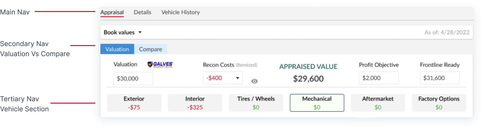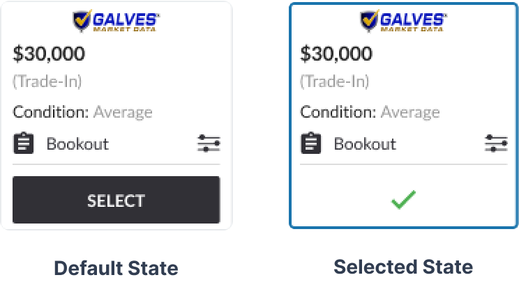 - These book value cards were placed on the top-left of the “Valuation” page; allowing fast and easy visibility, specifically because this is a crucial first step in appraising a vehicle.